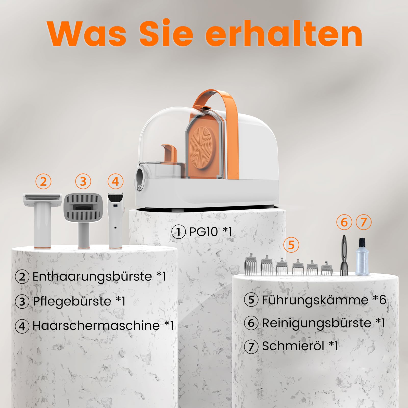 Packungsinhalt: 1 Haustierhaussauger, 1 elektrischer Rasierer, 1 Pflegebürste, 1 Entwirrungsbürste, 6 austauschbare Kämme, 1 Schmieröl, 1 Mini-Reinigungswerkzeug. Das Produkt beinhaltet eine 2-jährige Garantie. Bei Fragen zum Produkt kannst du uns gerne über Amazon-Nachrichten kontaktieren.