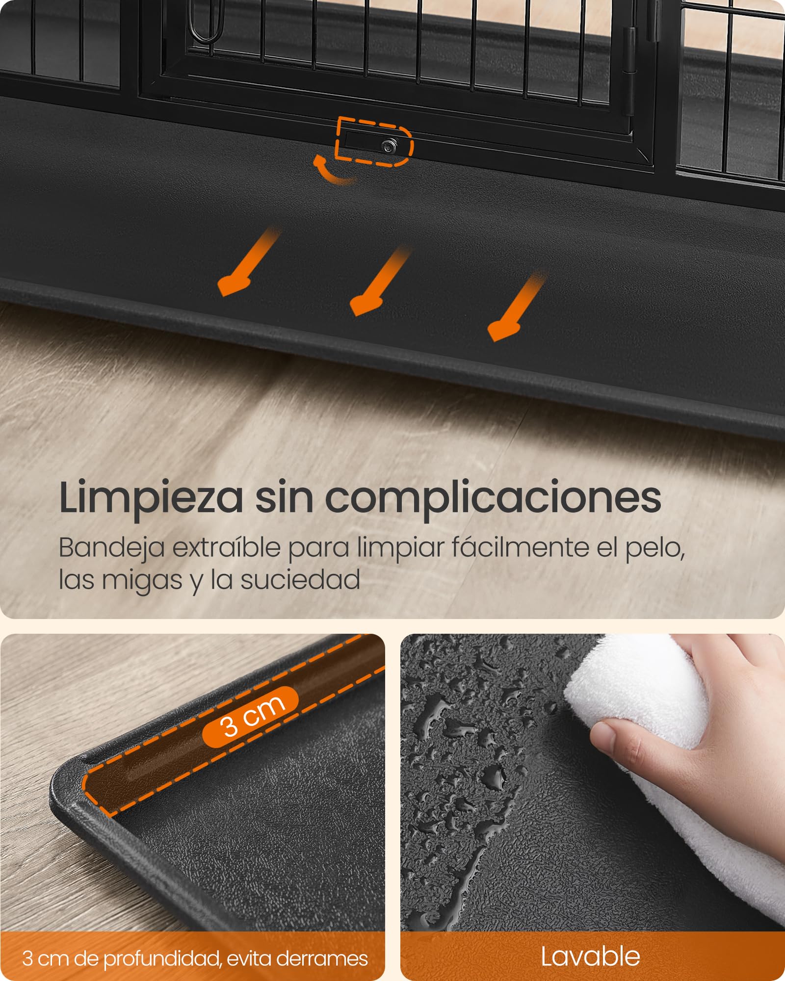 Der Hundekäfig kommt mit einer herausnehmbaren Bodenwanne, die das Reinigen des Käfigs erleichtert. Gib deinem pelzigen Freund einen sauberen und privaten Raum, den er sicher genießen wird.
