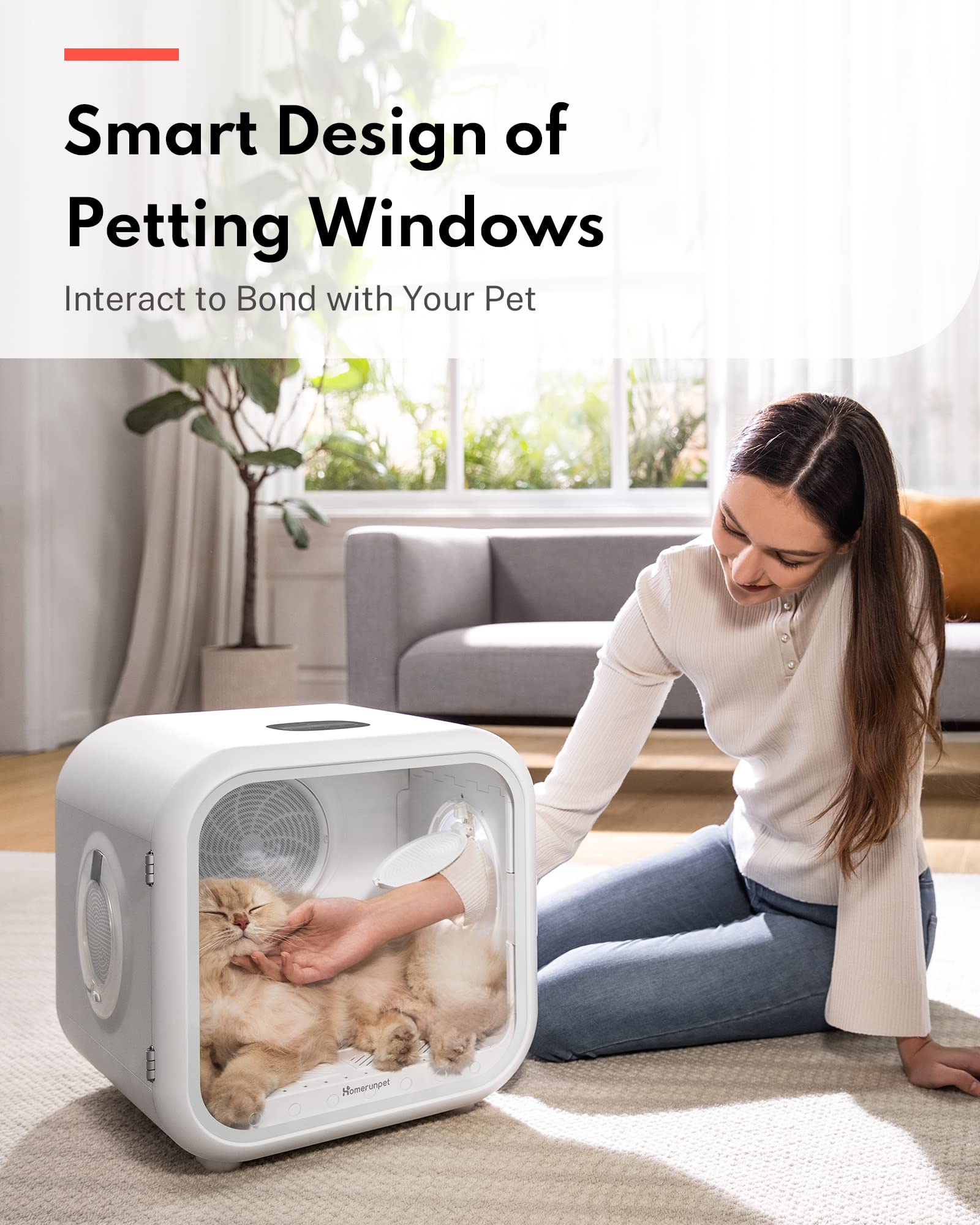 Die omnidirektionalen Luftströme gewährleisten eine gleichmäßige Abdeckung aller schwer zugänglichen Bereiche, während die Trocknungszeit deutlich verkürzt wird. Das Bedienfeld ermöglicht die einfache Anpassung von Temperatur, Heizstärke, Luftgeschwindigkeit und Trocknungszeit. Mit einem niedrigen Geräuschpegel von < 60 dB können Sie und Ihr Haustier die Zeit in Ruhe genießen. -
