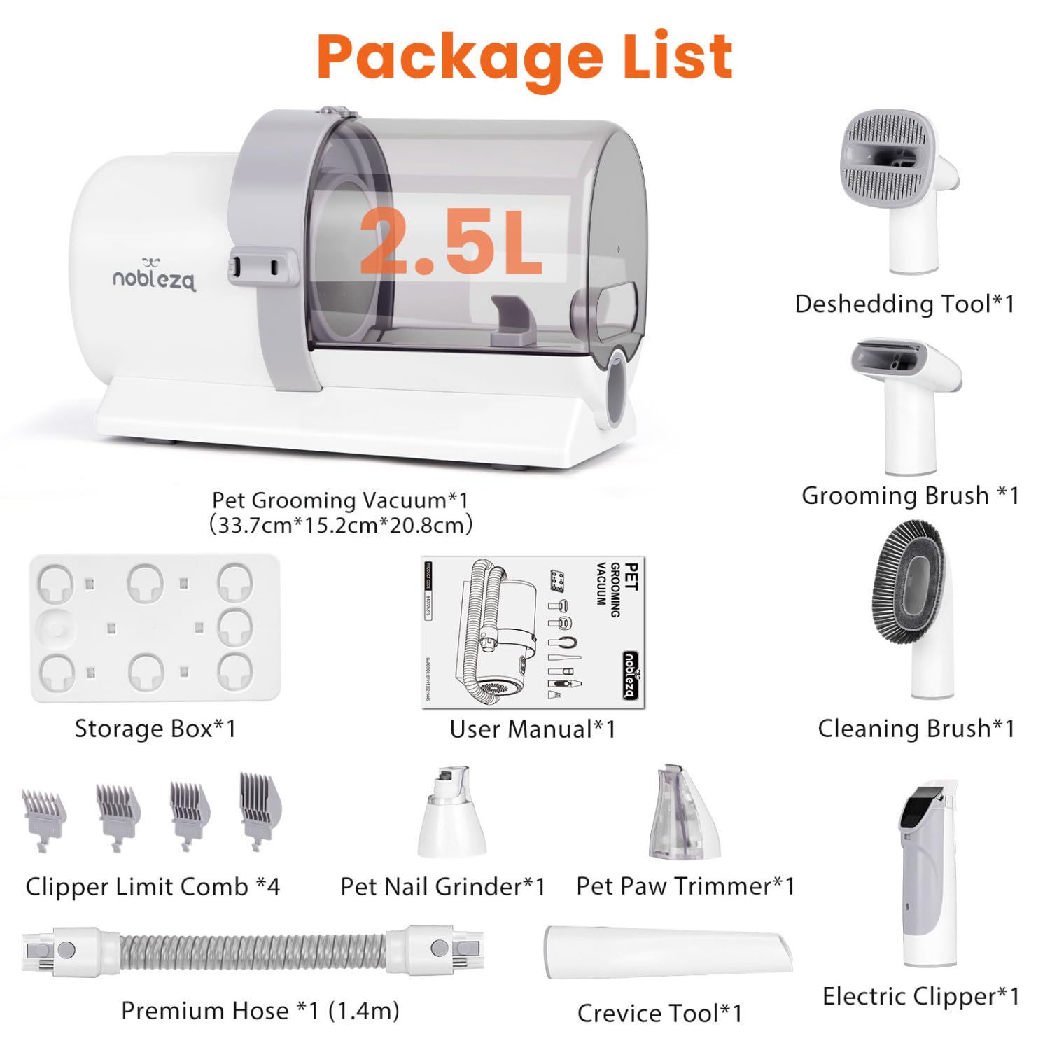 Der Nobleza Staubsauger für Hundhaare verfügt über einen 2,5-Liter-Staubbehälter, einen 1,4 m langen flexiblen Schlauch und ein 2,5 m langes Kabel, um Ihre Haustiere vom Motor fernzuhalten. Das ergonomische Design ermöglicht eine einfache Aufbewahrung der Zubehörteile, spart Platz und erleichtert den Transport.