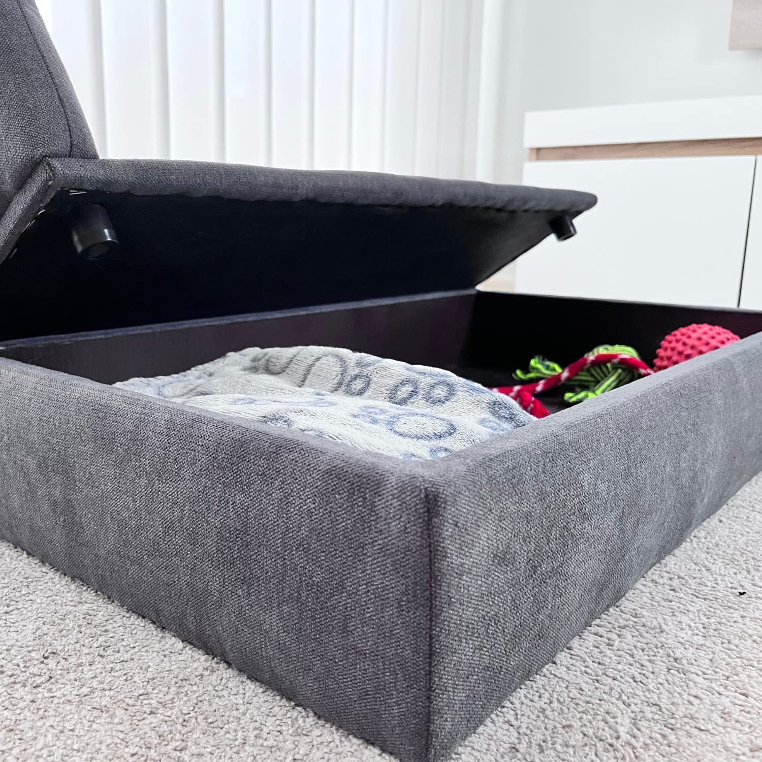 Dieses Sofa-Bett für Haustiere bietet nicht nur maximalen Komfort für deinen pelzigen Freund, sondern auch einen praktischen Stauraum im Unterteil. Entferne einfach die obere Schicht des Sofas und bewahre die gesamten Utensilien deines Haustiers wie Decken, Spielzeuge, Kleidung, Futter, Snacks usw. darin auf. Nie wieder nach einem Platz suchen!